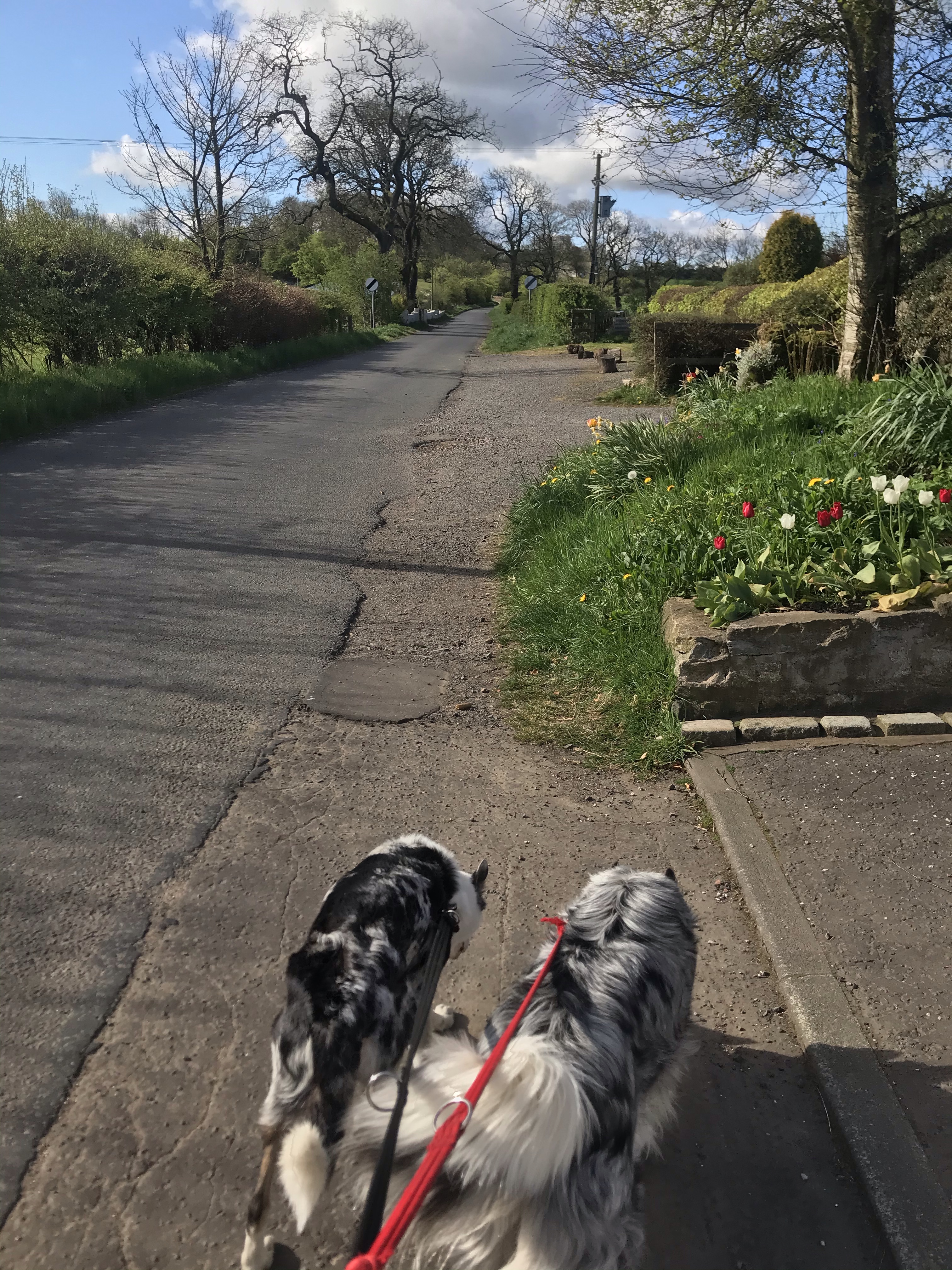 Few pics of the dogs in the sun before we left! Not letting go in case the others get it!Check how empty the roads were on the way to Asda LinwoodCraig dropped me off then went to get cheap fuel at £109.9 a litre the cheapest in a VERY long time. Then a drive to try and charge his leisure battery so he could run the diesel heater to stop carbon build up. I was in the queuing system in Asda. Didn’t wait long to get in but as I was queuing they suggested the Shop and Go app so you scan your food as you go round! U-MAZ-ING!!! Cuts the checkout time to minutes. Not gonna lie… the start of my shop was probs a lot longer than normal as I took a handheld scanner AND my phone… turns out I didn’t need the scanner lol. Had to wash the handheld scanner with disinfectant on a bit of blue roll… all while juggling phone, trying not to stand near anyone and not touch my face!!!